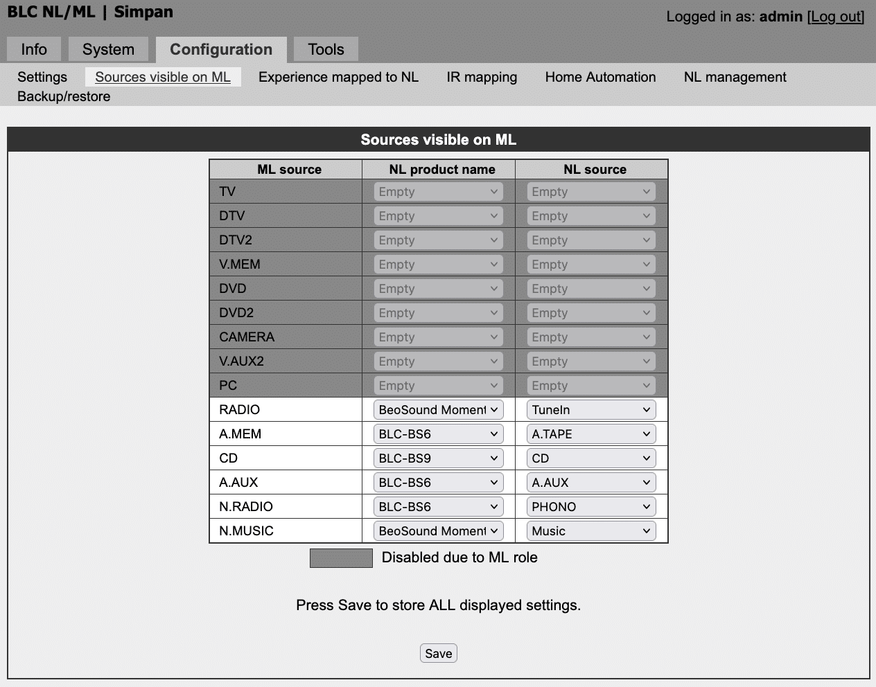 Right, so since the BLC is it’s own little ML it needs to have any of the A.master, V.Master or AV.master set and once I’ve done and tweaked the “Source visible to ML”; I could now play CD’s from BS9000 and play cassette from BS6500. But, when trying to play TuneIn (Radio) or Music (N.MUSIC) from the Moment then the BL3500 quickly indicate source and then powers off (including that it also powered off the BS6500 stereo) all other units in the ML-network. To be mentioned is that the Beolink 1611 has fw 1.3 and whether that is an issue or not… So, half there 😀