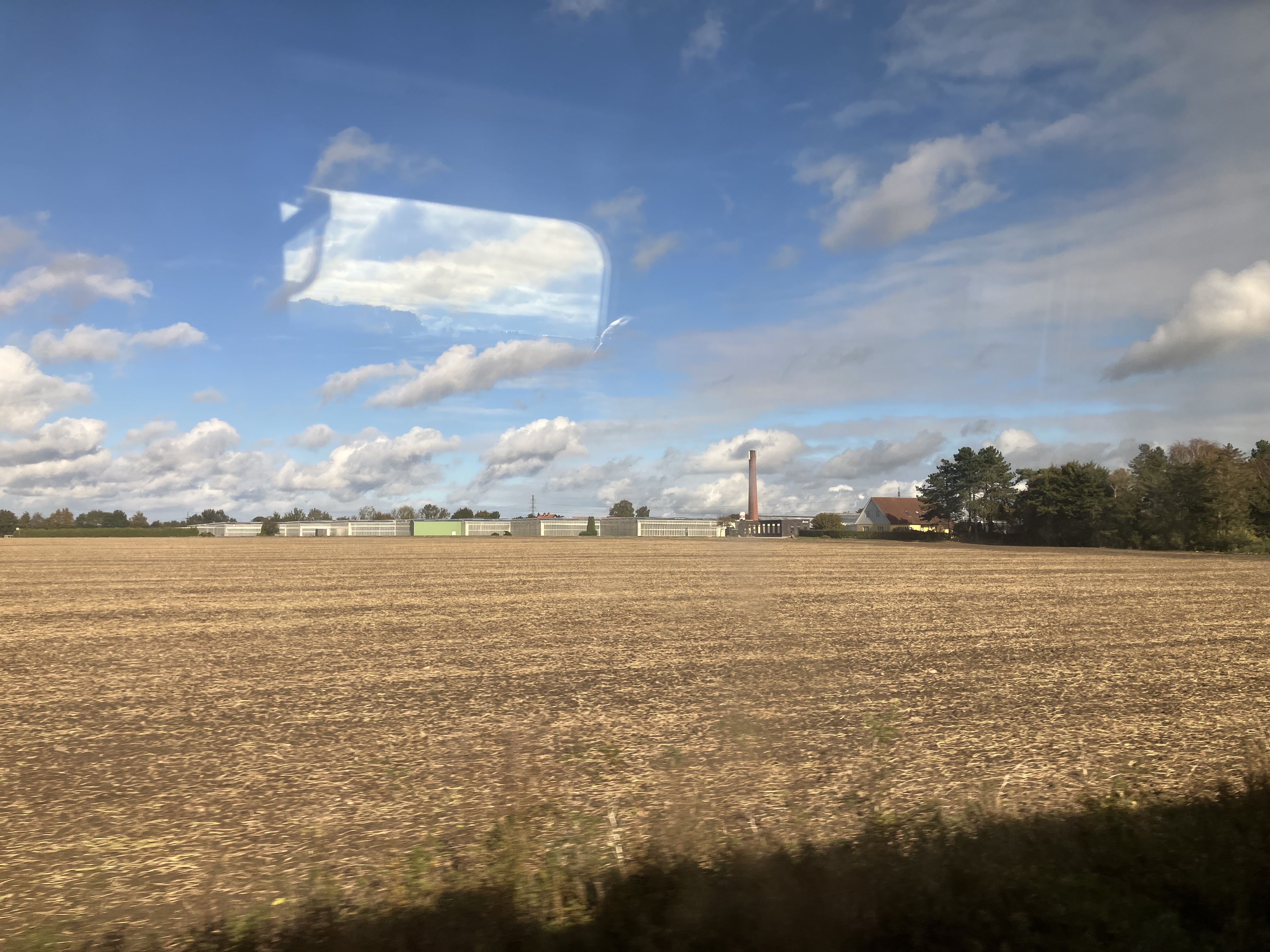 I’m on the train from København H – big puffy clouds and a blue sky.