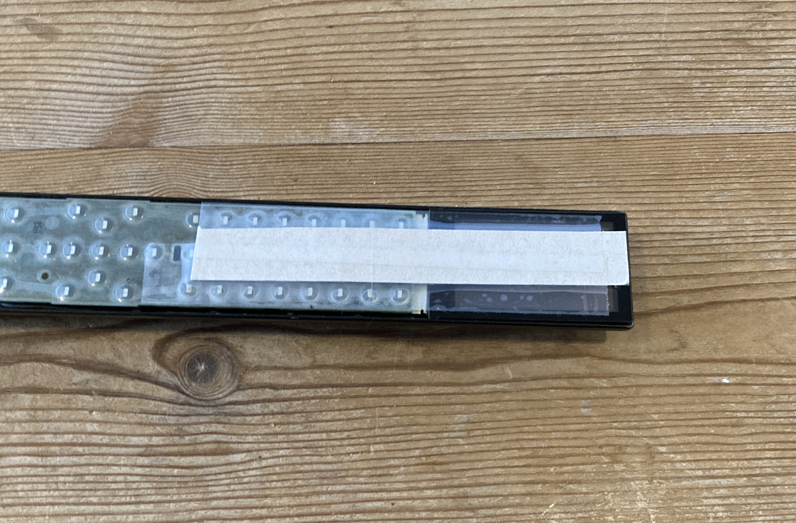 I had some thought about how to protect the display cable on the Beolink 5000 with no missing lines, and ended up with a relativly simple solution. I placed a piece of thick cardboard on the front of the remote covering the display and about the same lenght on the keyboard part. Then I used regular tape to attache the cardboard to the surface of both the display and the keyboard section. On the keyboard PCB i put a piece of tape around it all to secure it.