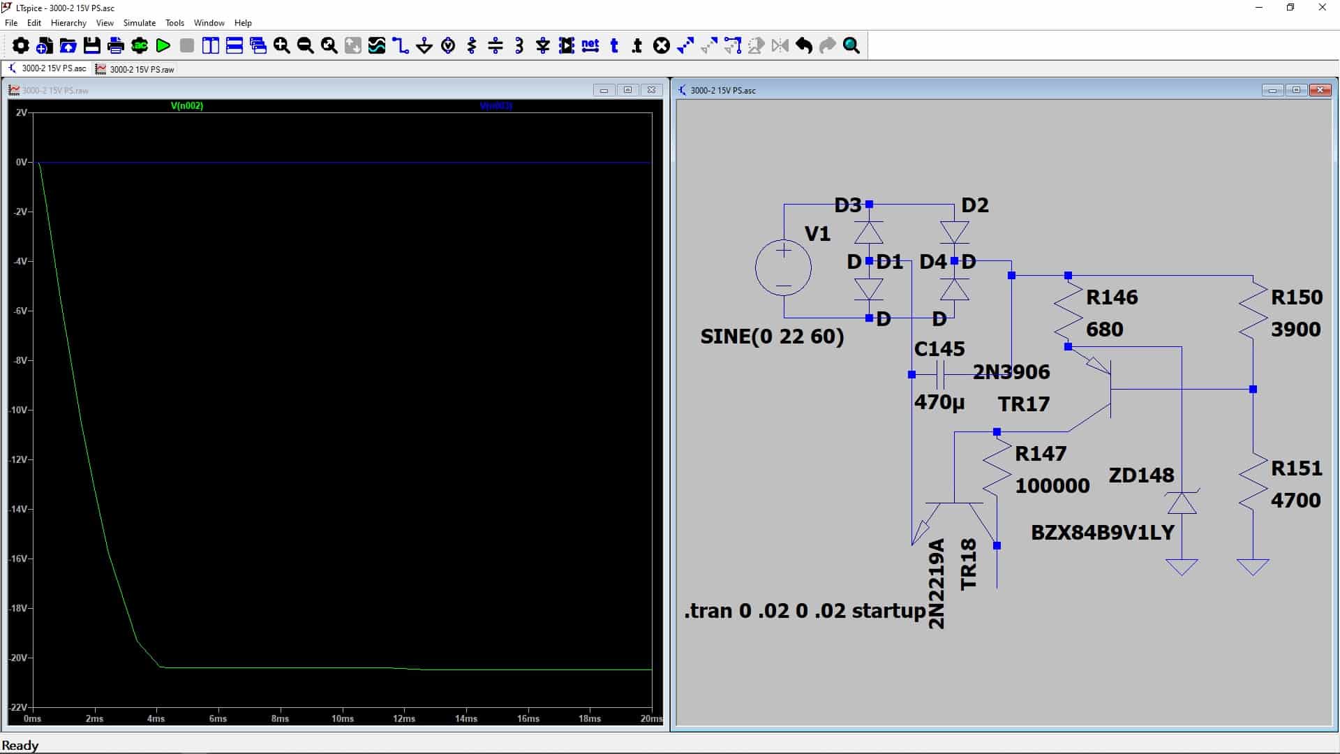 One idea was that the 15V PS load is too small – I confirmed in LTSpice that if the load is 1ohm, the PS won’t engage.