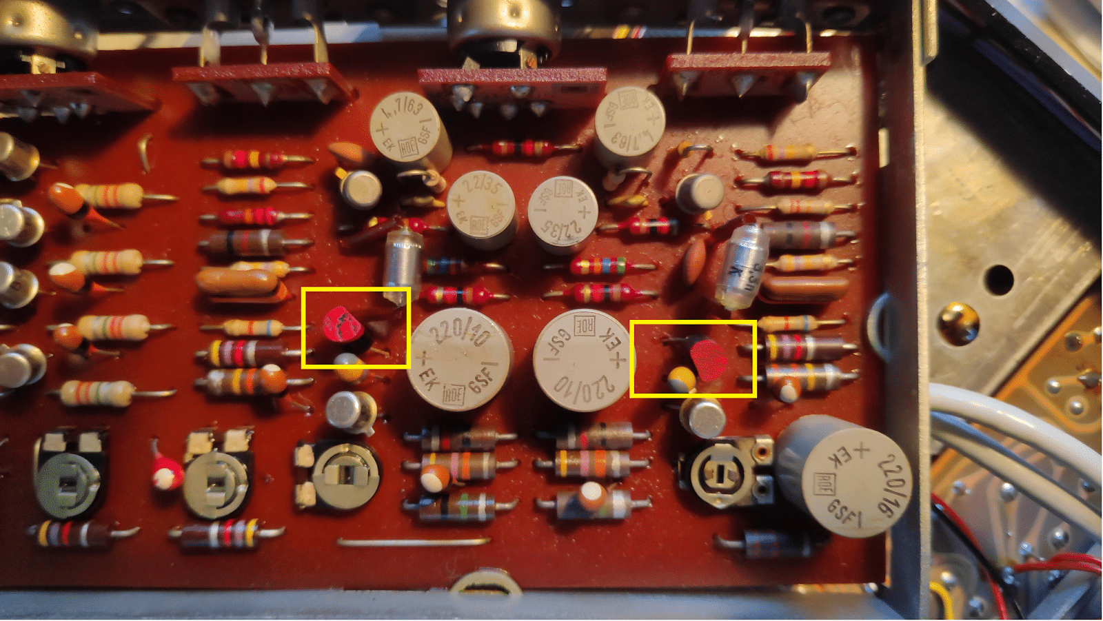 Soldered it back together and we’re back in business w/out distortion.I did notice that one emitter resistor is reading low idle voltage drop compared to the other one (settled on putting it at 10mV with the other one at 14mV). I don’t have any equipment sensitive enough to measure 0.15ohms so I wasn’t able to confirm whether or not it has drifted … so I just hooked it up, set idle current according to the manual and it’s back in action (again) and sounding great via Q1 (my record player) and Q2 / Tape (my CD player).The FM issue remains … the tuner range maxes out at 105kHz now, I get static when the stereo light is on, etc. Digging into that next …7 January 2026 at 17:57 #72412hcraig244