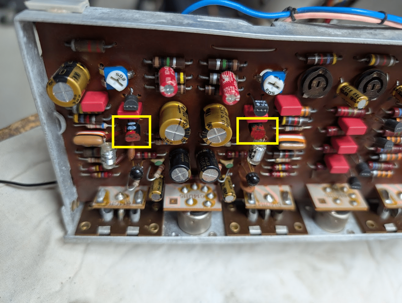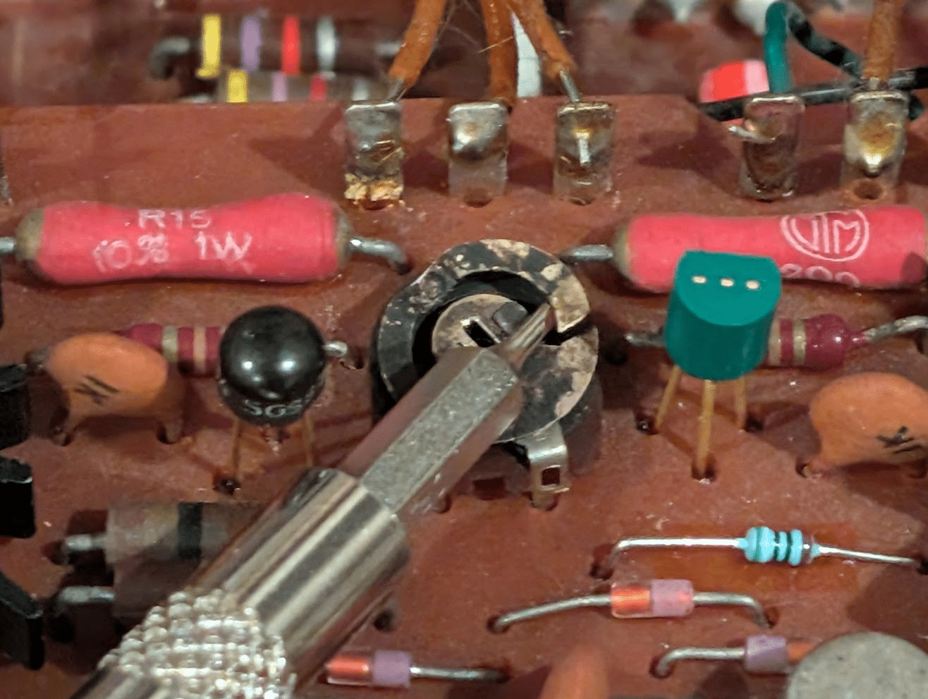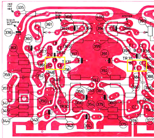Q1 didn’t work because – surprise (to me) – the pin orientation on the PCB of TR31 and TR35 are cock-eyed relative to the package. In other words, instead of going straight into their emitter / base / collector holes – like every other transistor in this thing – they go in sideways. And also, there’s an error in the service manual. TR35’s E and B are switched! So don’t install TR35 as shown.